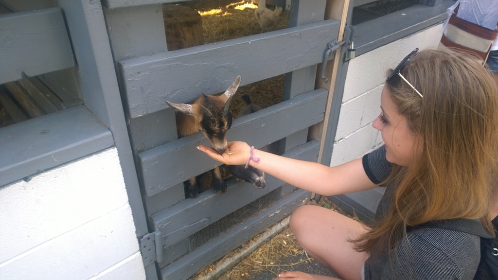 WP_20140712_15_03_26_ProAfter the house tour we walked around the farm and Sasha was having a great time feeding every animal that she could. It wasn’t too hot out so it was nice to relax outside fro a while. Watching animals run about has a very Zen appeal to it.  They had an example of a typical schoolhouse showing the layout (all grades in one room). They go t school up through eighth grade, and take no science. In Alabama or Mississippi I think this would get them a doctorate.  We walked around a bit more and I ended up chatting for a bit with an older Amish woman. I thanked her for opening their community, and mentioned that we were visiting family in Philadelphia. She was really nice, and we ended up trading addresses. Now I have an Amish pen pal. (I will have to check the internet to see how stamps work, apparently you can write on paper, put it in a envelope, and some guy will carry it across the country so the name you write on the outside. How quaint)
