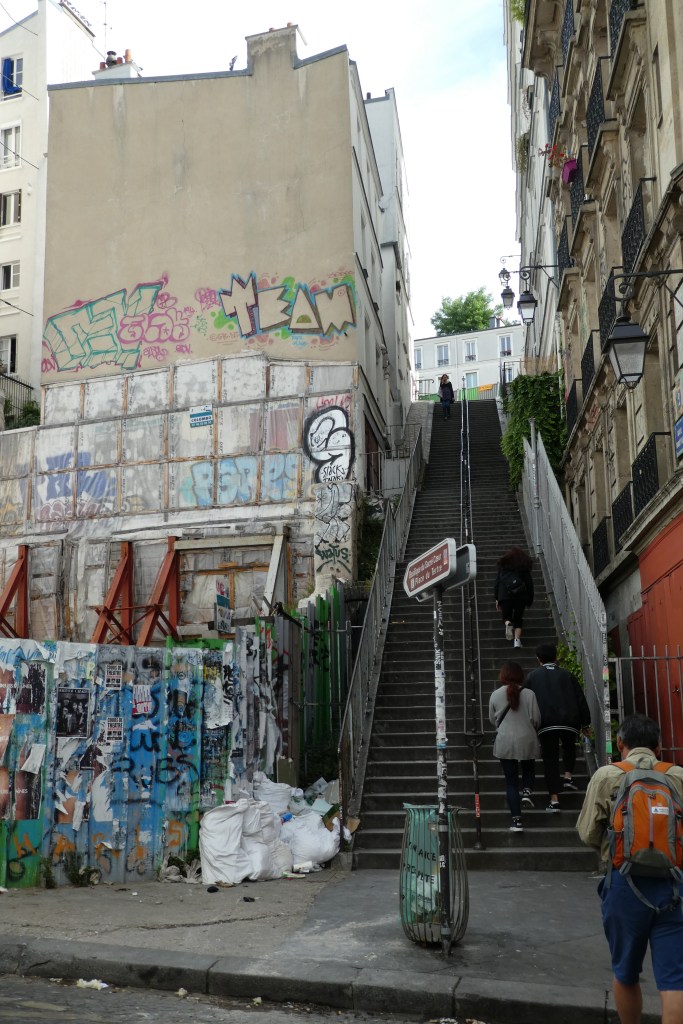We were early to Montmartre, so the line at Sacre Coeur was almost nothing. Last time we were here, the line wrapped around the block, so we took the opportunity to get through and see the cathedral. Naturally, the cathedral was amazing, but the climb to the dome was the event. it was 300 steps up a narrow spiral staircase. At some points my shoulders would touch both sides, and at others my head would touch the archways, but ducking a lot helped that. Once out of the spiral you climb the pathways along the rooftop to the center f the cathedral, then you start the spiral staircase again. All along the way the views of Paris just keep getting better. At the top, it was stunning, in addition to the vista of Paris, you could see out the the newer modern buildings and the city simply stretched out as far as you can see. You could also see the areas of the cathedral that were never cleaned. The white marble of Sacre Coeur used to be black from Coal smoke pollution. Not slightly grey and dirty, but solid black. You can still see this in some areas.