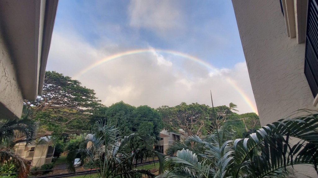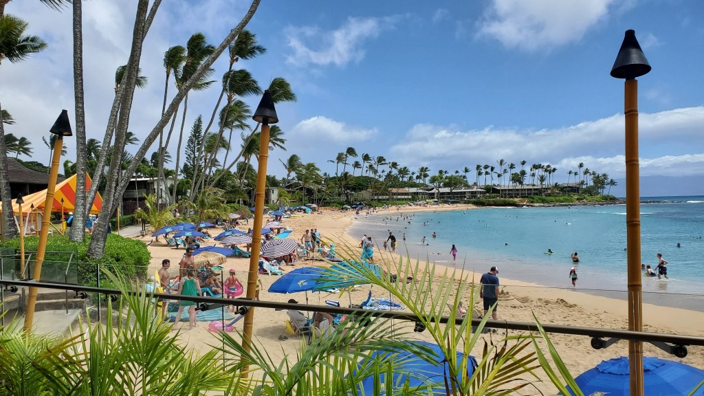 We drove around the point, and found the place tucked into Napili Bay. It frankly was much better than I expected. There was no wait, and it had a panoramic view of the whole beach. The beach itself was crowded, and the winds were kicking up again. A perfect time to be getting lunch inside. There were a few cloudbursts as well, so our timing was perfect this time. We loved the food and took our time there. Even with the weather, the beach remained crowded. I think that might be the biggest advantage of the smaller place we are staying at – lack of crowds. You can always go to another beach, but you can’t chase crowds away.