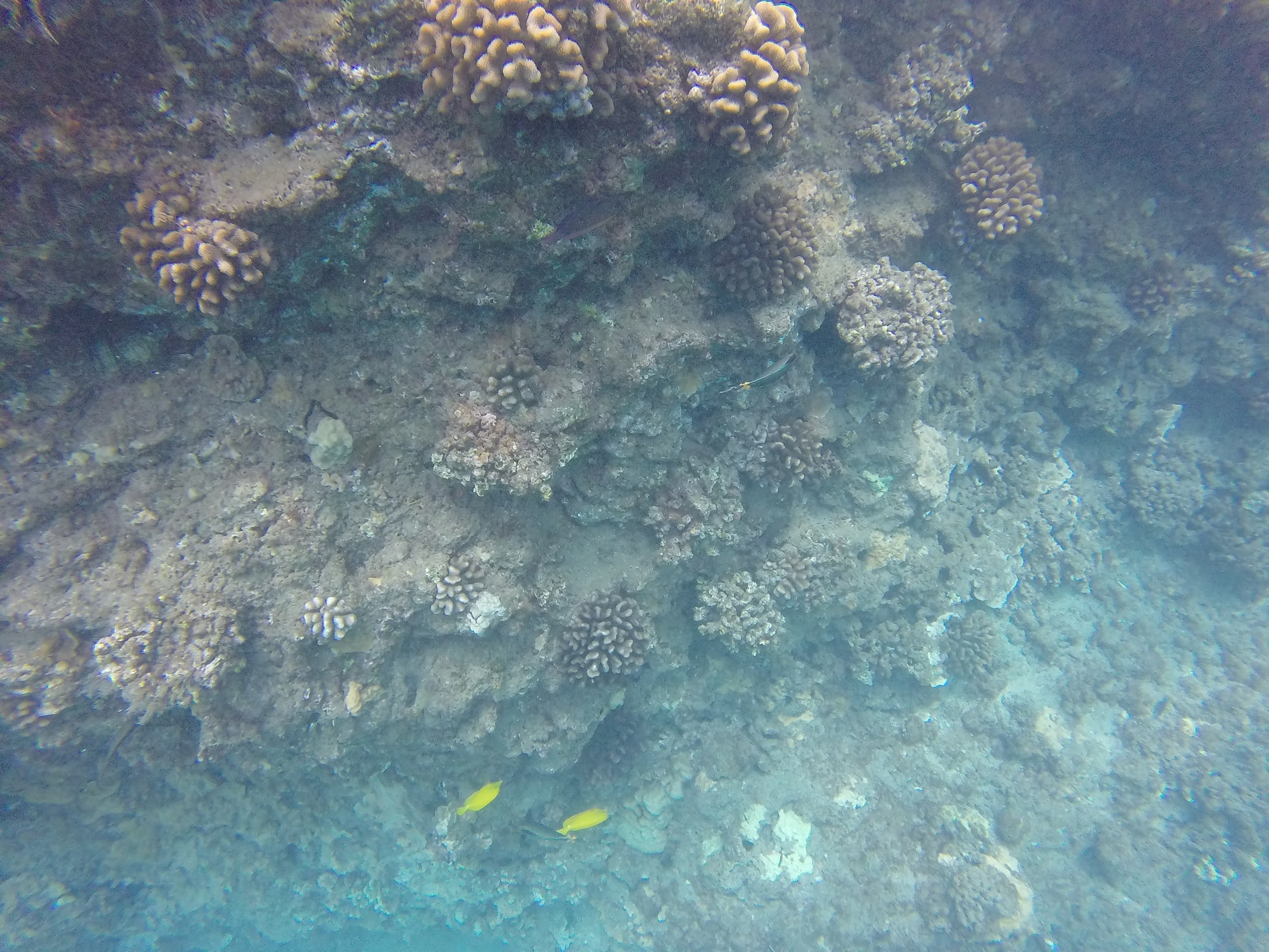 It was Amazing. Bright fish were feeding everywhere. Schools of needlefish were floating with the waves as I approached, and they largely ignored me. The reef extended below the water and was filled with fish feeding off the algae. I took a few photos and swam back over to Yulia to show her the reef. We watched the fish for a bit then swam to get the others. I ended up making three trips swimming out and back. It was worth it as this had to be the best snorkeling we have had on this trip. But when we returned to the beach the last time I was exhausted. The rest were starving as well, so we went up to the beach bar at the Sheraton for a late lunch.