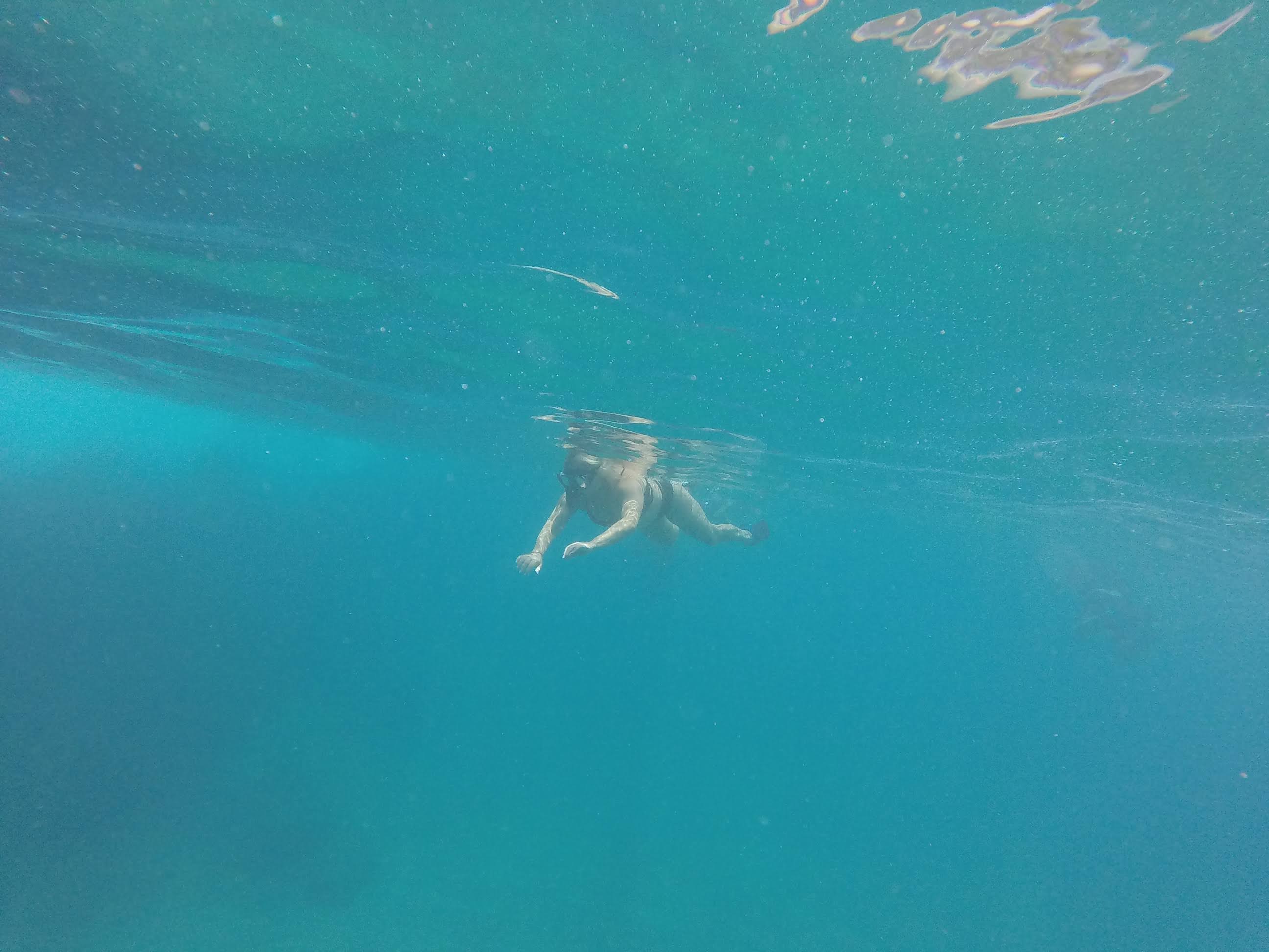 I suited up and Yulia was with me. Sasha and Petru we swimming a bit but didn’t take their gear out at first. I was looking about and didn’t see much in the area. It was pretty sandy and plain. I kept swimming and headed for a rock outcropping where a bunch on young (stupid) kids were cliff jumping. The approach had a few fish to see, but nothing special. I was far from the others and approached the rock face of the cliff.