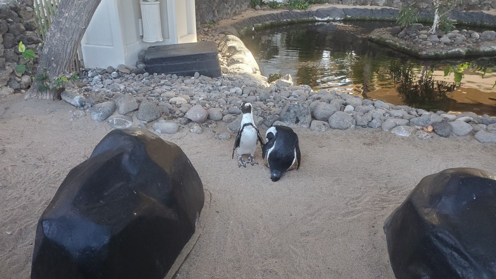 After working through the morning crowds we walked into the Hyatt. It also had some beach damage like our condo – but not nearly as severe. Last time we were here a lot of it was under remodeling, so the place looked really nice, but the pool and beach area was already filling up. It’s crazy how many people are here right now. We did a loop of the lobby, restaurants, and gardens around the pool. It’s a nice setup – they have several terraces going up from the beach. A restaurant is in one, a big tanning area in another. There’s a group of penguins in the lobby – right across from their giant Koi pond. Quite convenient just in case you need a penguin on short notice.