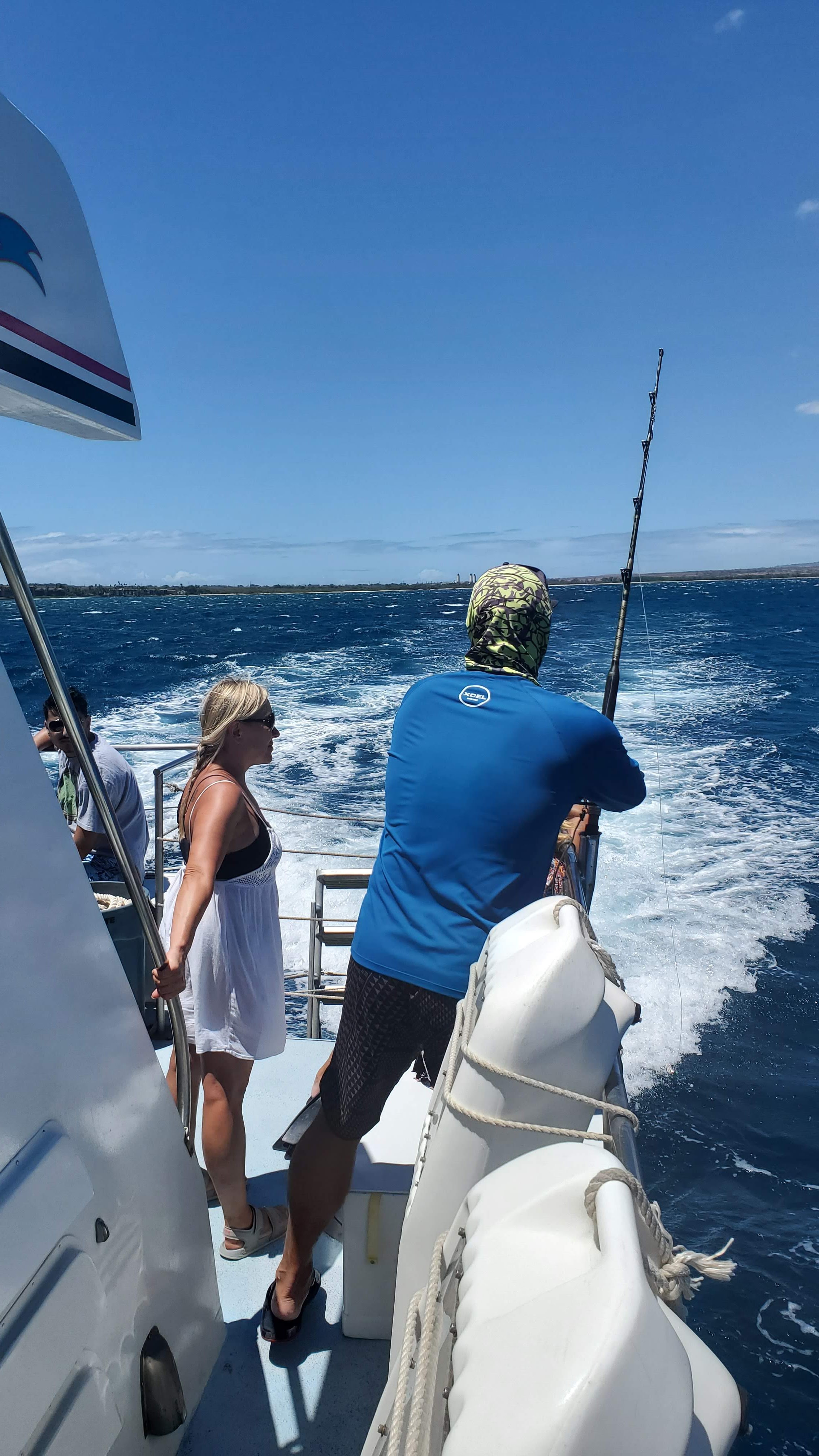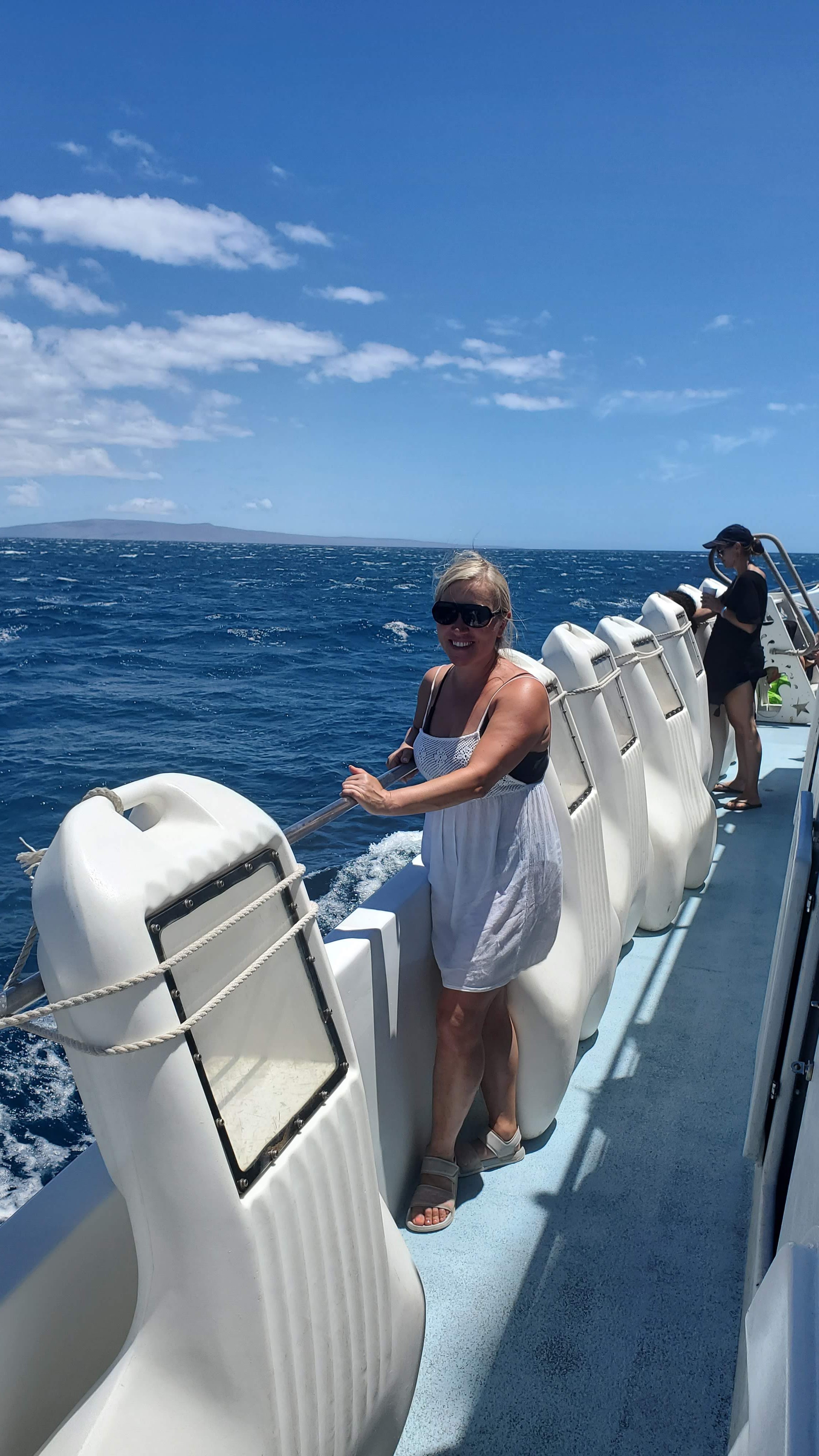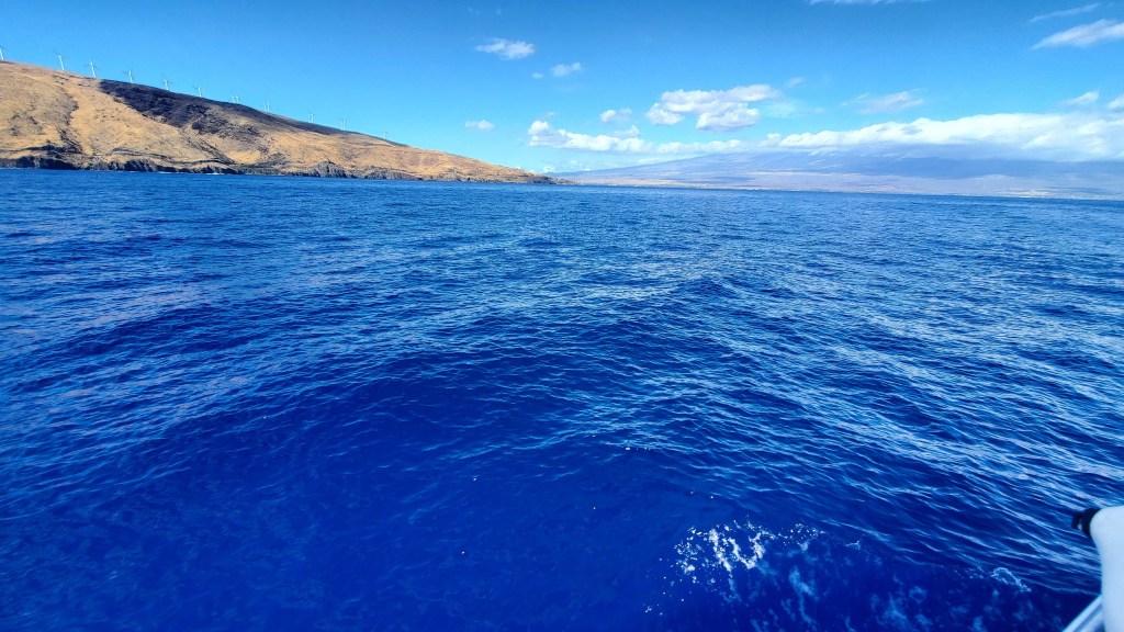 We drove towards the Ma’alea Harbor just before 12:30. It was hot out – around 93 degrees in Lahaina. We weren’t sure what it would be like on the water but from our own boating knowledge it is always hotter or colder than you expect. so we were sunscreened up and had some towels and shirts to cover as well. I didn’t want to freeze or burn. It was a hot drive down – fortunately traffic was pretty good, and we made good time. Once at the Harbor i really needed to get a baseball hat – the winds were strong still and straw hats don’t mix. I grabbed one at a tourist shop and we headed to the docks.