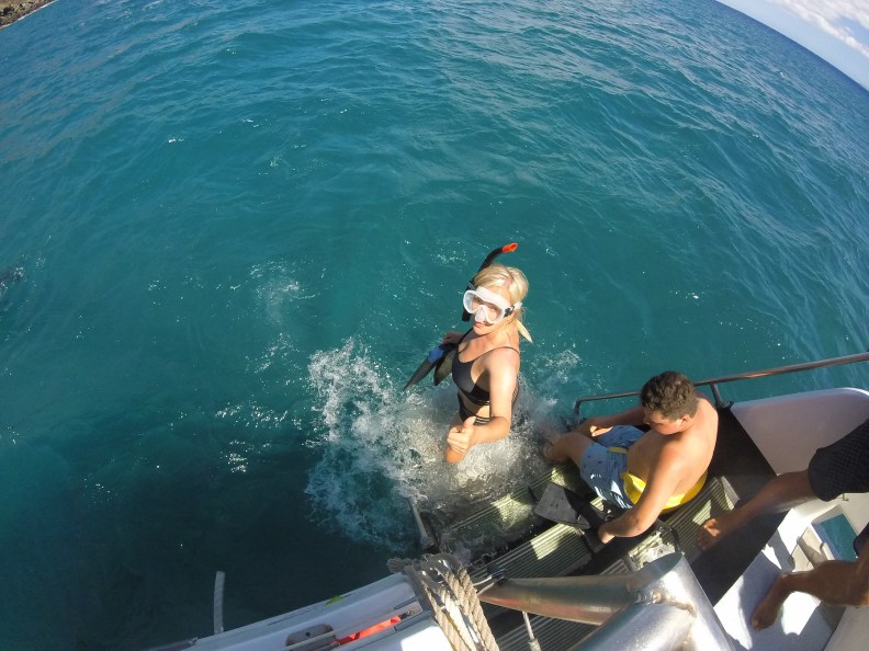 We rounded the point of western Maui and things got a bit calmer. By the time we made it to our destination it was far better – still waves but nothing serious. A crewmember dove off the front to hook us up to a mooring block under water. They don’t want to anchor here as that runs the risk of dragging and damaging the coral. Once secured we were ready to Snorkel.