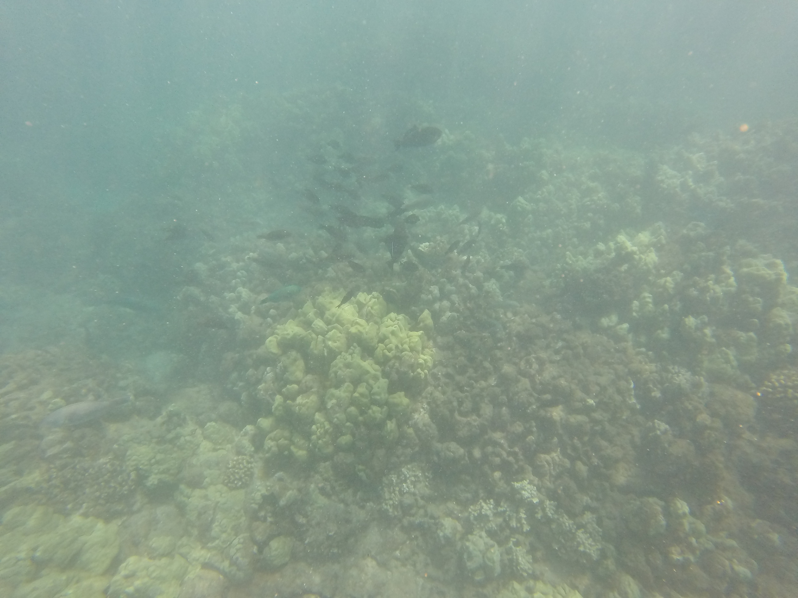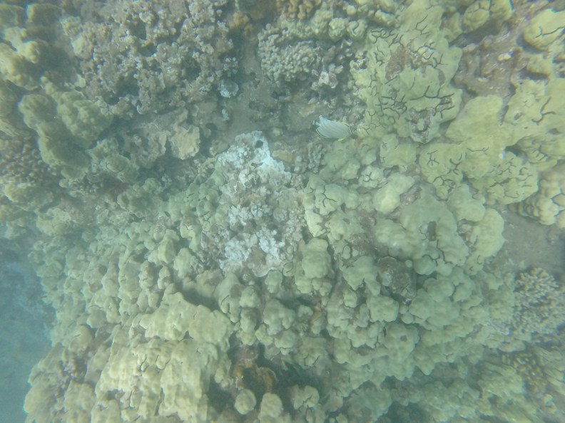 The water was really nice, no cold shock for a change. Yulia was already ahead of me, so I kicked up my speed and swam out to meet here. The boat was up in a sandy area, so we had to go towards shore to see anything. But not too far across I was met with a huge school of black Triggerfish. The swam about – ignoring me. I kept going and started to find the coral – there were many colors out here. It was really impressive and very different from the volcanic rock snorkeling that we did at Black Rock. There was lots of color in the fish here and more schools than I saw before. the schools were feeding right on the coral, before the waves would shuffle the school around. The waves were still going, but were better than I expected. This was easily the best snorkeling so far in this or the last several trips.