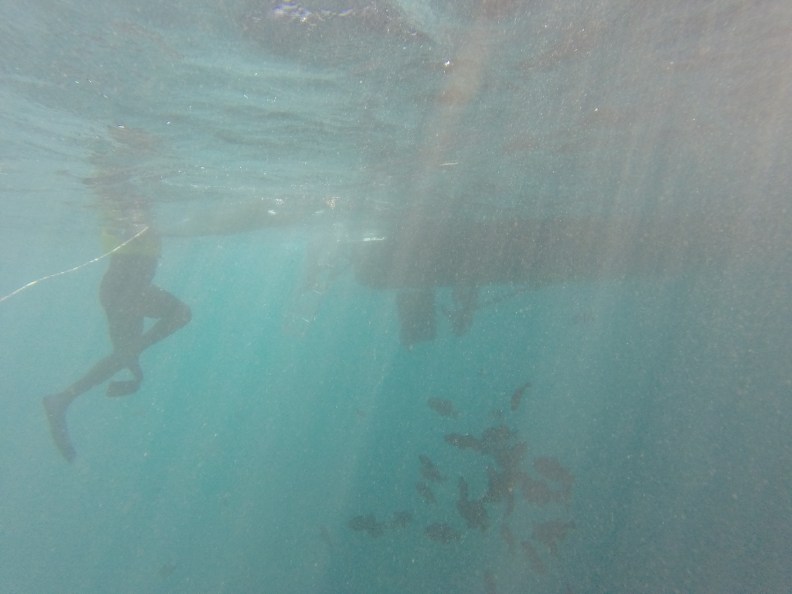 The groups started coming back, and we found that the schools of triggerfish were now coming up to the boat and we could see them from the surface. at the back, that was because the drippings from the BBQ were getting snacked on b the fish. We had another school scrambling around our side as well. That turned out to be because one of the families had never been on a boat before and were getting seasick over the side. Whatever brings the fish works for me.