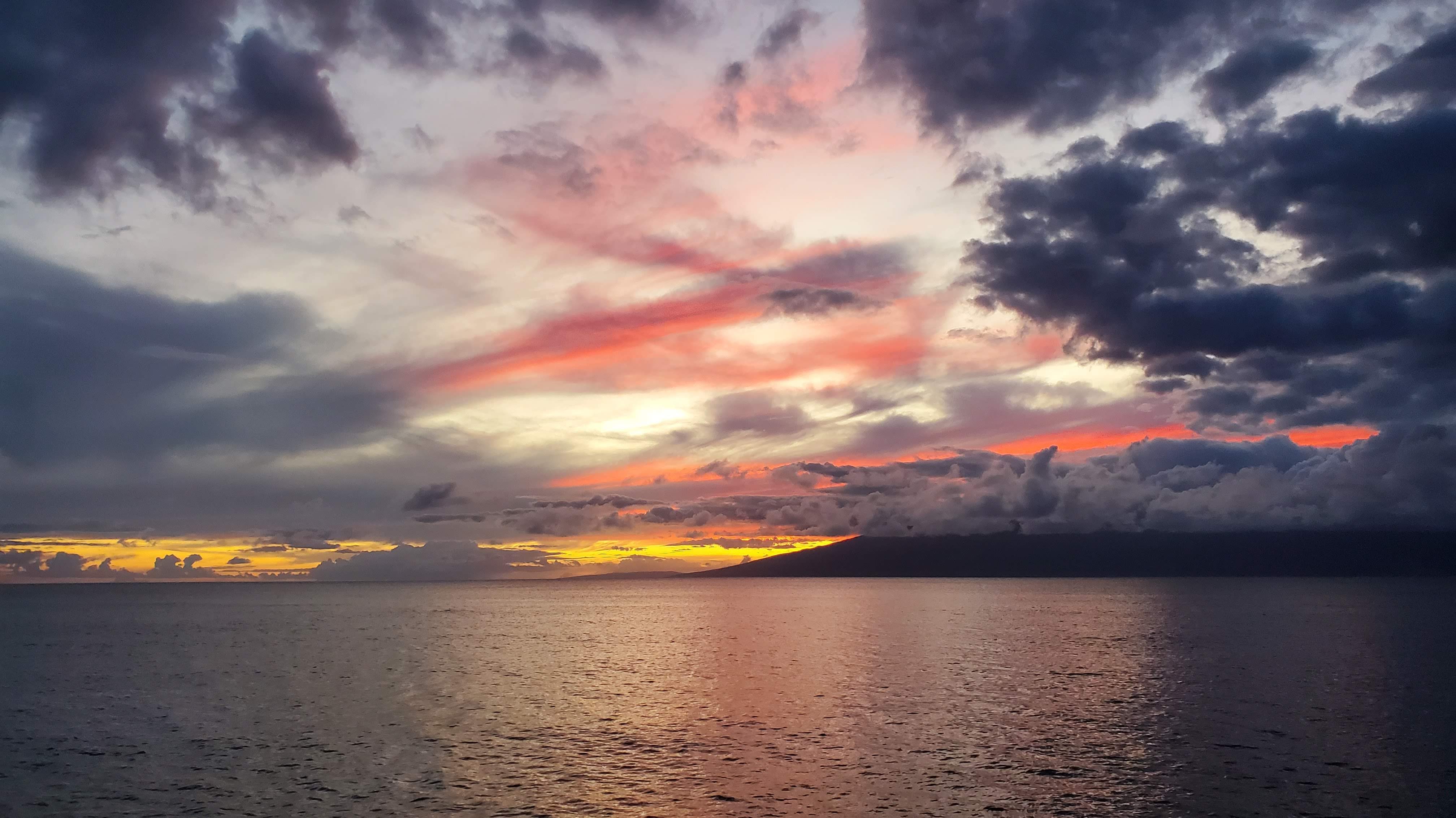 I bought way too much food, but it was all excellent. Kaluha Pork, Pork Lumpia, Banana Lumpia, Loco Moco. Just something light for the evening. The turtles came back out and were feeding on the sea wall again. We pointed them out to some new arrivals, and just chatted away poolside and relaxed. The sunset lit up the sky over the islands. It was a great finish to our last day.