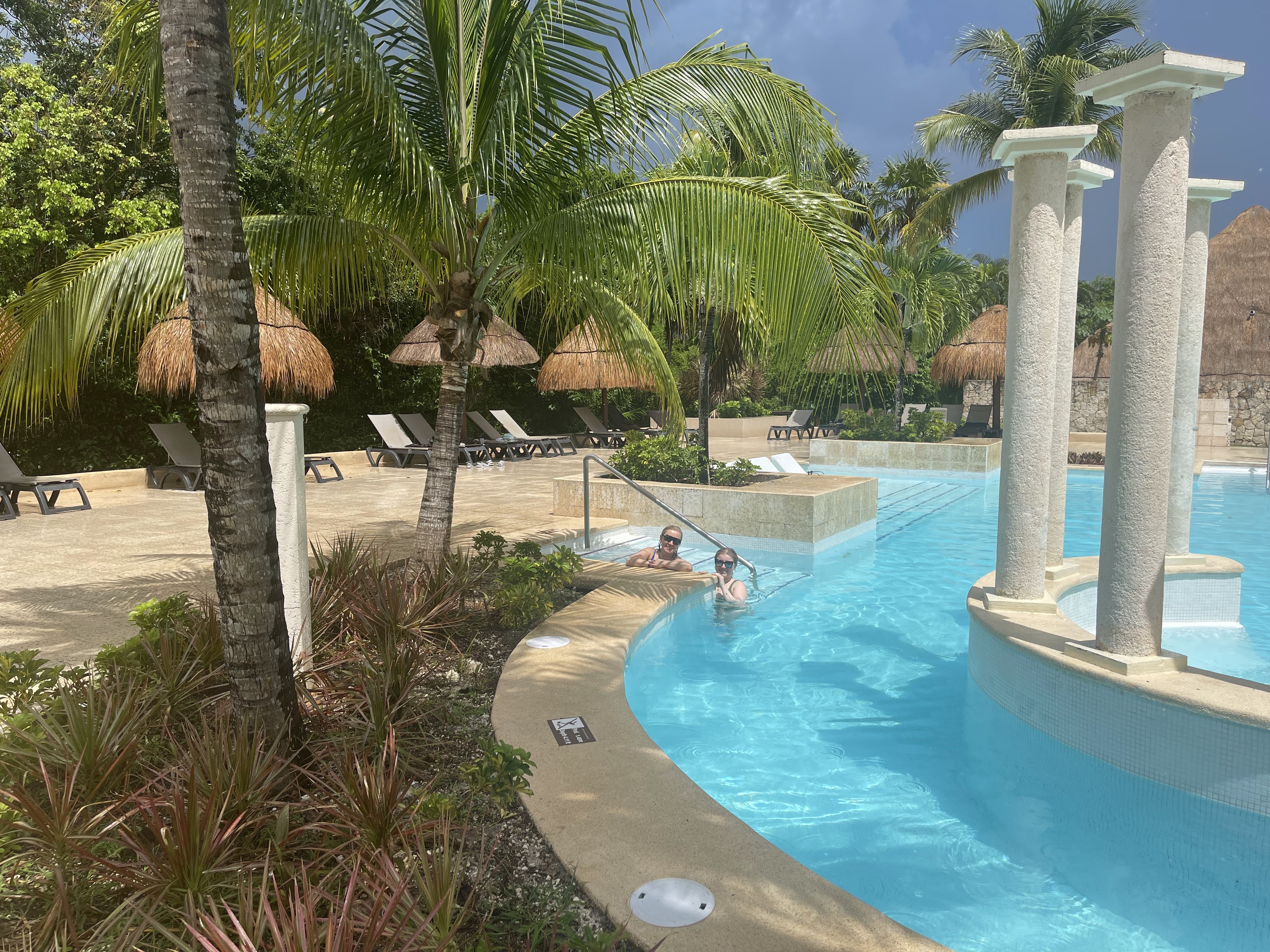 We finally made it to the Hotel after a good landing, slow passport control, and a fast shuttle weaving through Mexican traffic. The entrance to each resort it seriously imposing, and from the highway you really don’t know what anything looks like. We were dropped off at the front of our hotel, and it was amazing – a big grand open entrance, with a porter who ran to grab out bags and point us in the right direction. It’s amazingly well organized – far better than the places in Cabo we have visited. There was live music on a stage to the side, and people milling about in a little “market” in the atruim of the lobby. the scale was massive. This resort was far larger than I expected, with two main hotel entrances, and an assortment of pools, villas and restaurants.