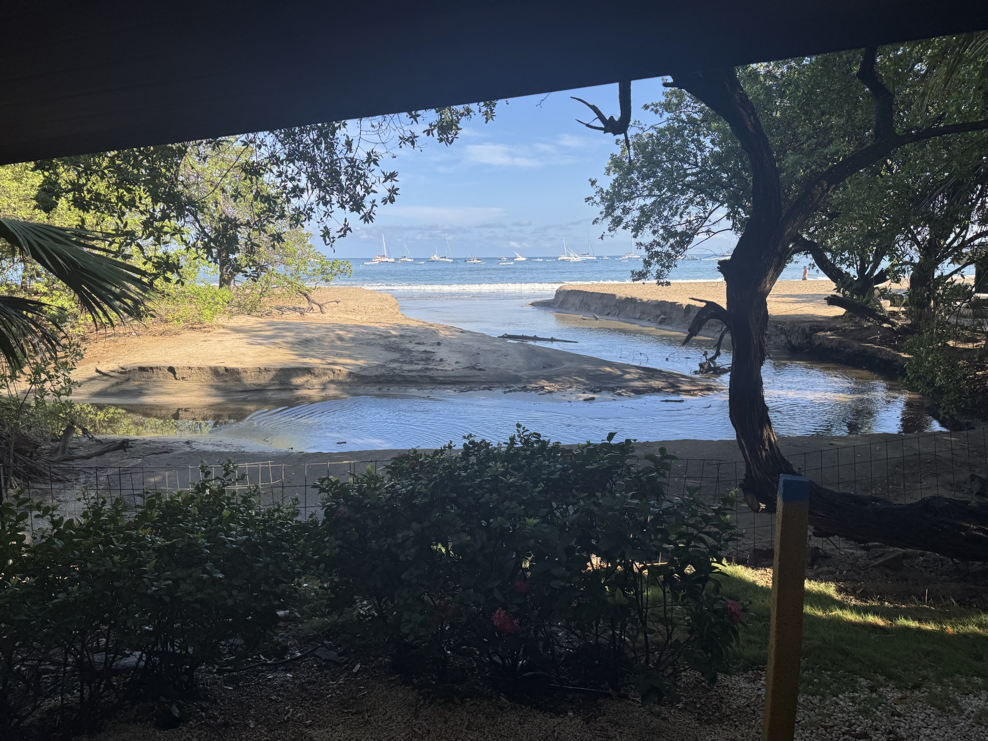 Once we pulled into the resort it was a relief to stop moving. We walked from the van and were greeted by the Manager. A high energy man who introduced himself as Mauricio. He got our luggage moved to the small office in front, and showed us around. This was a very small resort, the entrance was the restaurant and bar, it was open and faced the ocean with tables stretching out into the sand. Past the beach we could see boats anchored out in the bay. The Bungalows were behind the restaurant, but since it was 8:00 am we had to wait to check in.