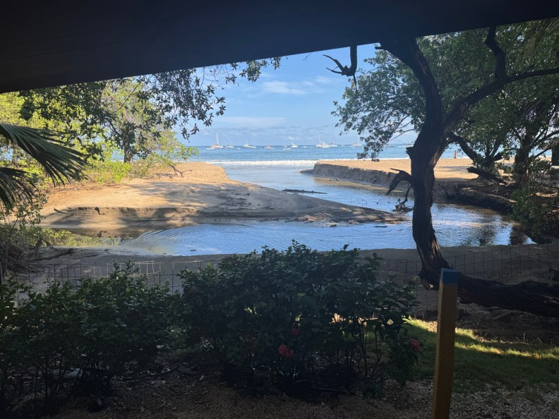 The crocodile creek in front of out bungalow was filling with water fast. It was a trickle earlier in the day, but was a rushing river now, and was eating away at the sandy banks. We stood on the porch and watched coconuts float by in front of us and more and more sand fall into the water as the river ate away at the shore, moving closer and closer to the bar patio. It was crazy to watch and with the water pouring we were pretty much stuck in the house. We could see the staff bringing cushions and chairs in to keep it all from getting soaked and blown away, but everyone cleared off the beach and took cover like us. It was a few hours before things calmed down and we could check out the place.